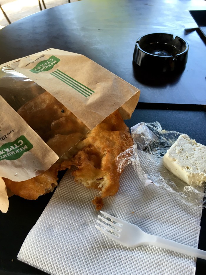 We stopped halfway at a rest stop that had a delicious snack. If you ever find yourself on the road from Skopje to Ohrid, you need to stop and have this snack. It is a delicious fried bread, and they give you a block of cheese on the side to eat with it. And, per usual around here, they recommend you drink yogurt with it. Get it. You won’t regret it.
